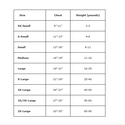 2XL: Chest: 24–27" | Weight: 40–50 lbs.