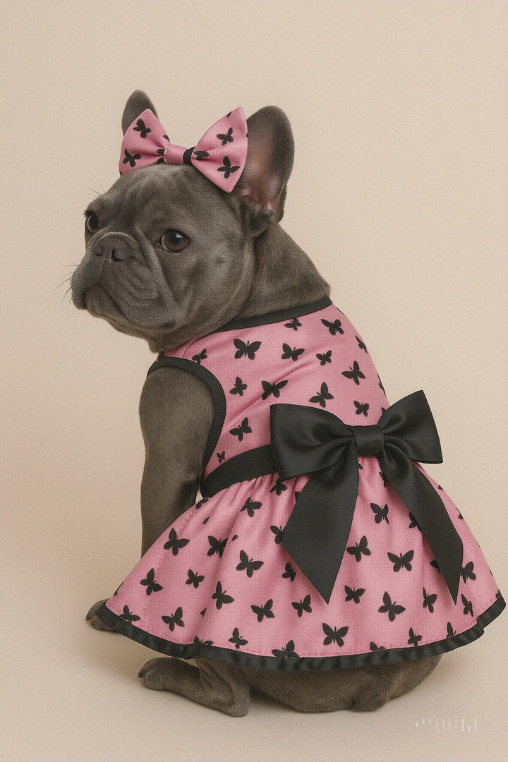 The Pink & Black Dog Dress is all about twirls, flair, and compliments. With a graceful butterfly print and a bold satin bow, this dress turns sidewalks into runways. A matching satin leash completes the look (XL size excludes leash), while the secure Velcro closure makes getting dressed a breeze β no wardrobe malfunctions here. Whether itβs a party, a stroll, or a photo shoot, this look is made to impress.