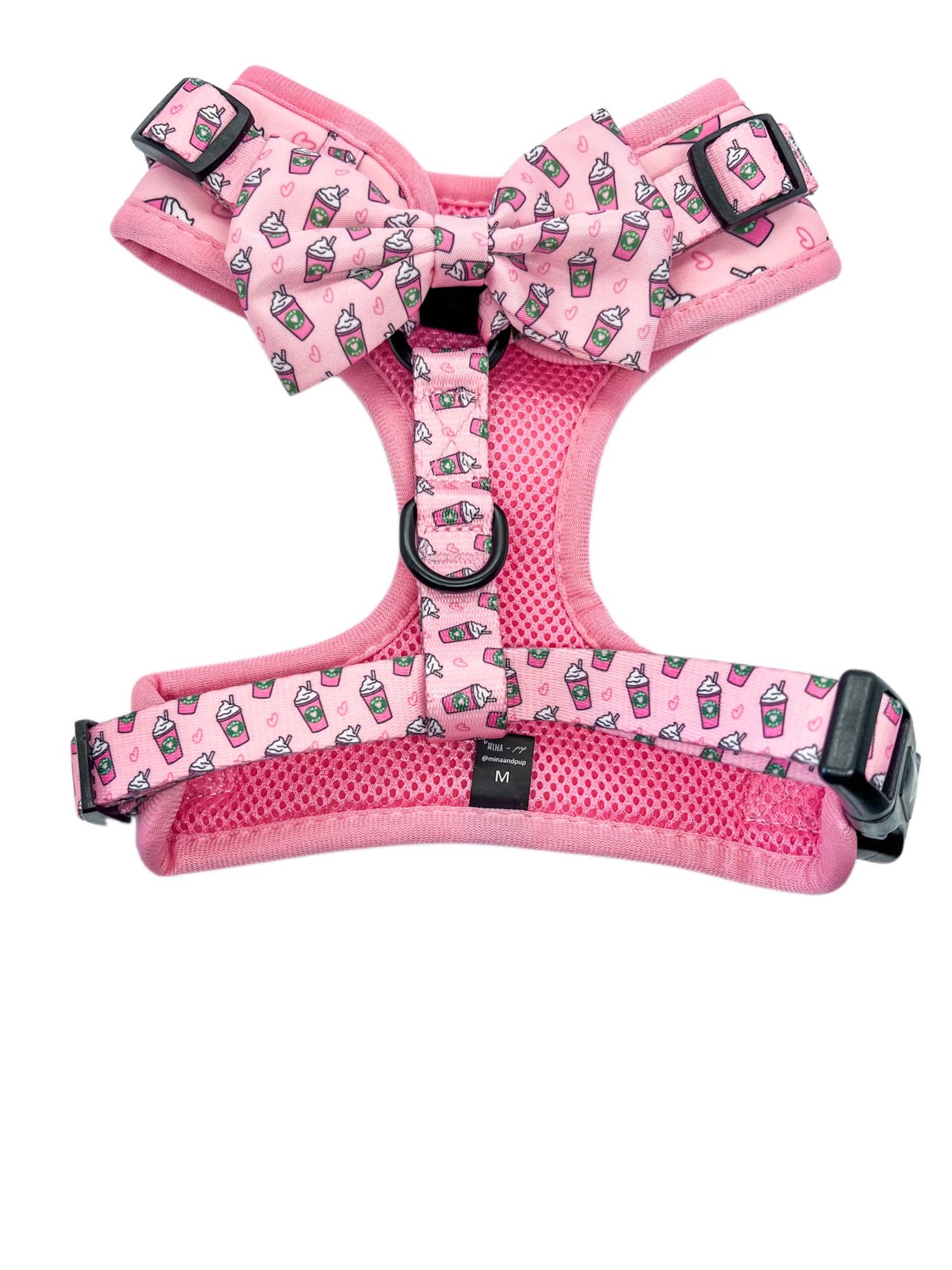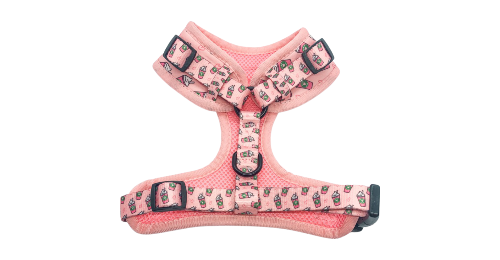The Pink Pupshake Adjustable Harness brings café cuteness and all-day comfort to your dog’s wardrobe. With an all-over pink pupshake print, this harness is made from water-repellent neoprene and a breathable mesh underside to keep your pup cool, dry, and stylish. Adjustable straps provide a secure, customized fit—perfect for coffee runs, brunch hangouts, or casual park strolls. Whether they’re striking a pose or chasing squirrels, this harness is all about playful comfort.